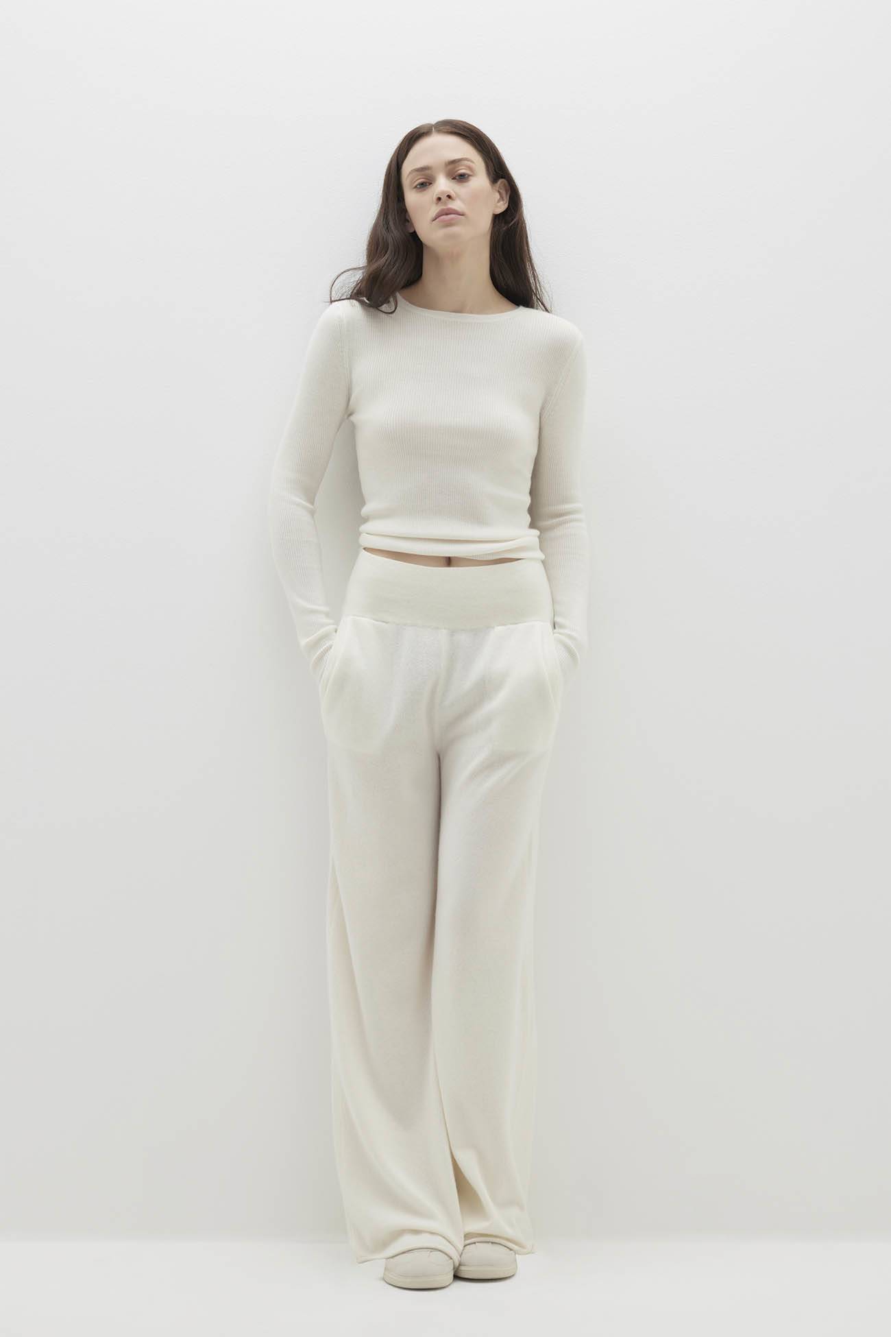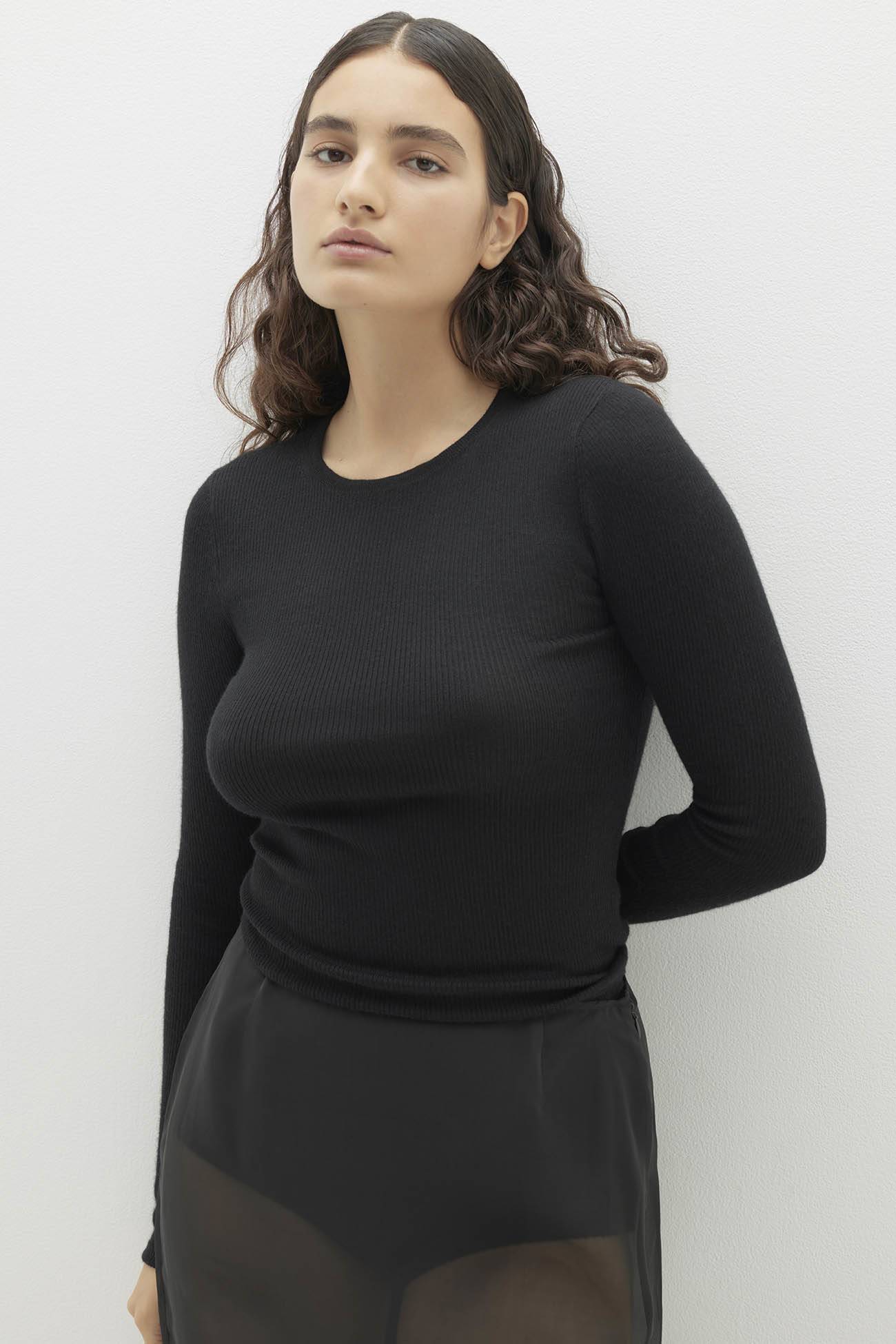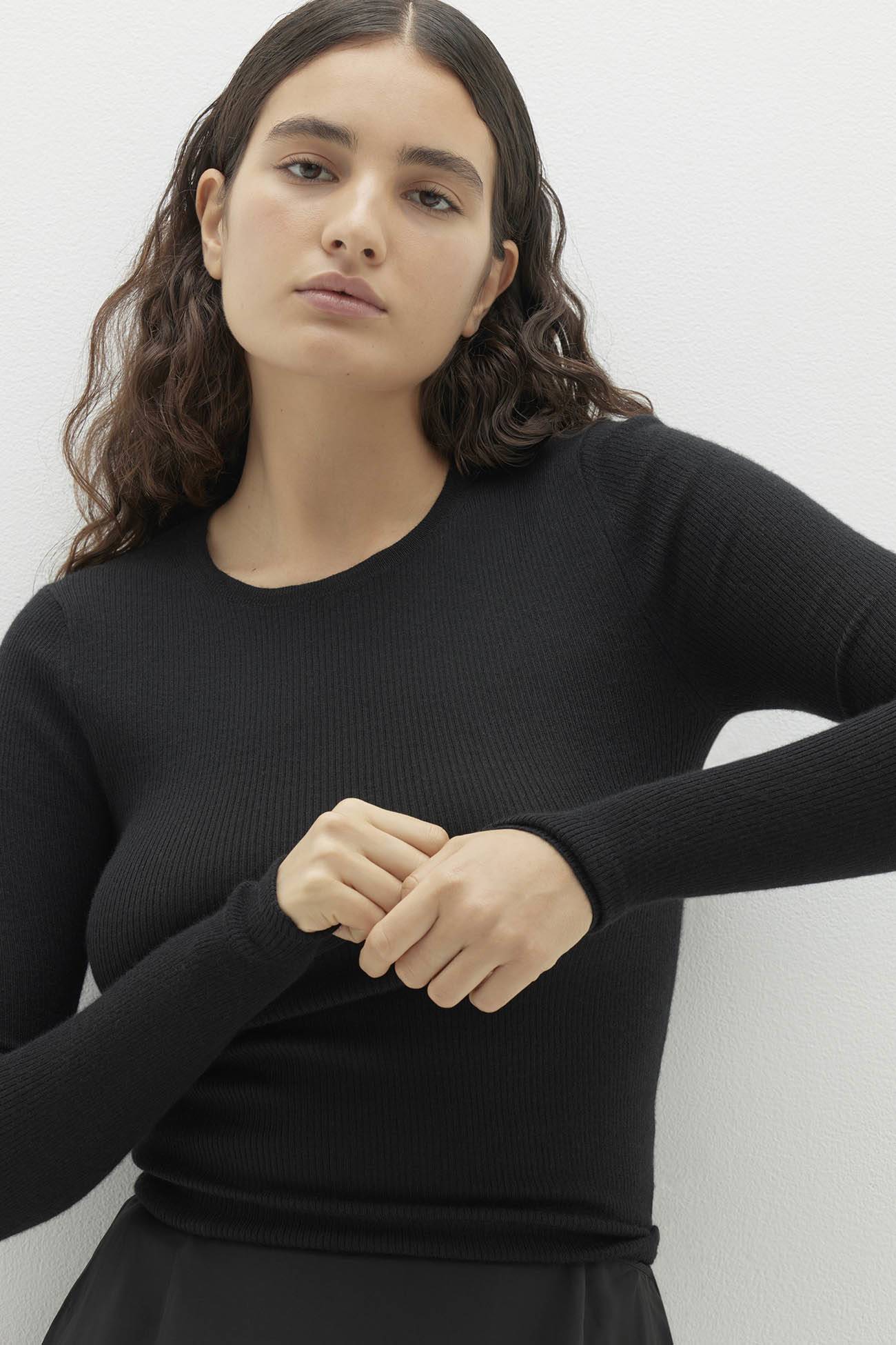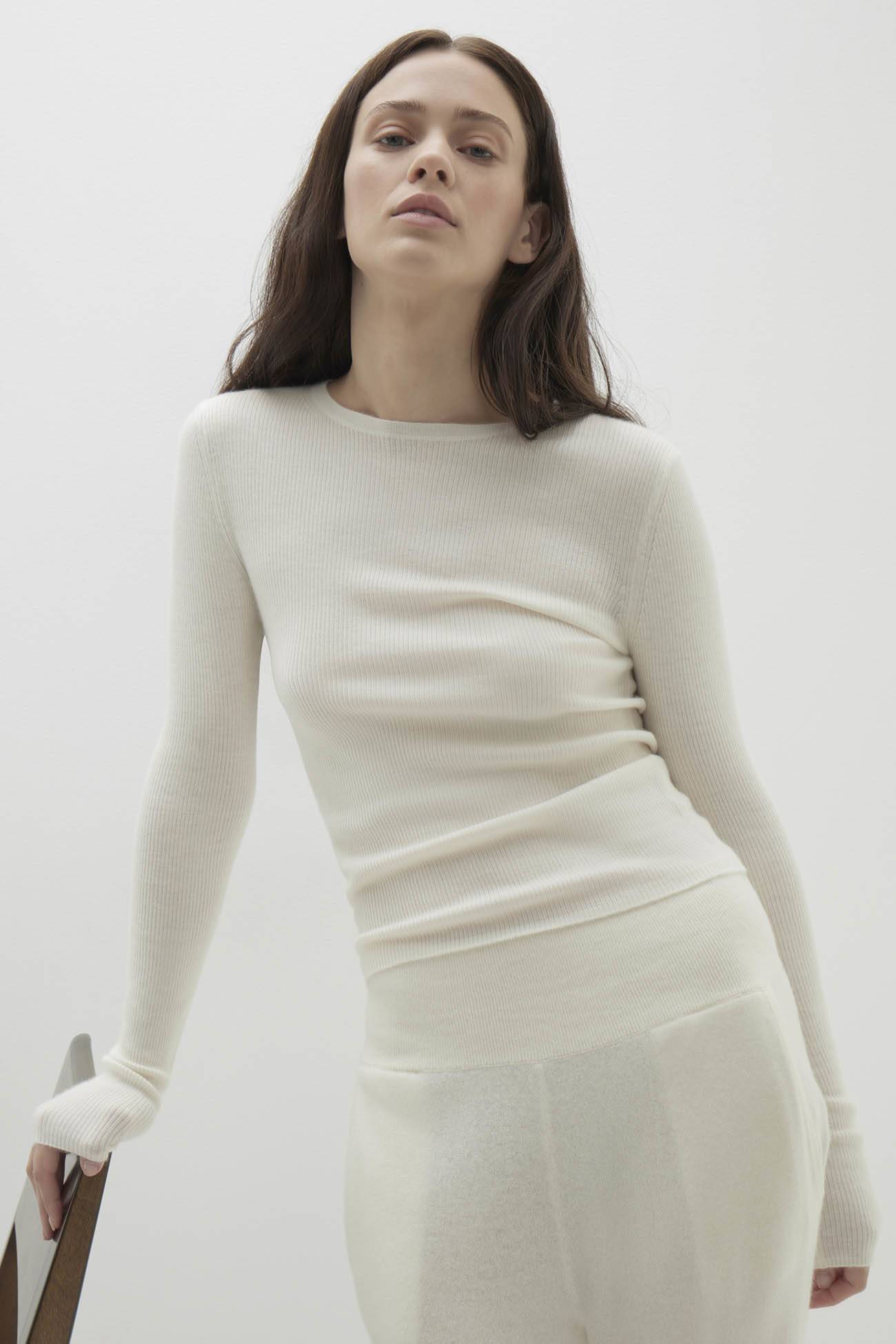 This fitted cashmere crewneck top combines luxurious comfort with a timeless silhouette. The fine rib detail throughout, long sleeves and classic crewneck design make it a versatile piece for any wardrobe.