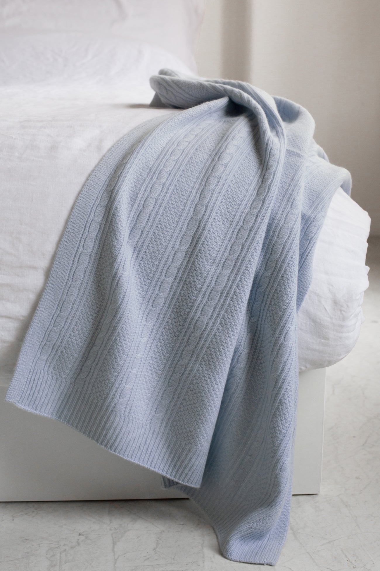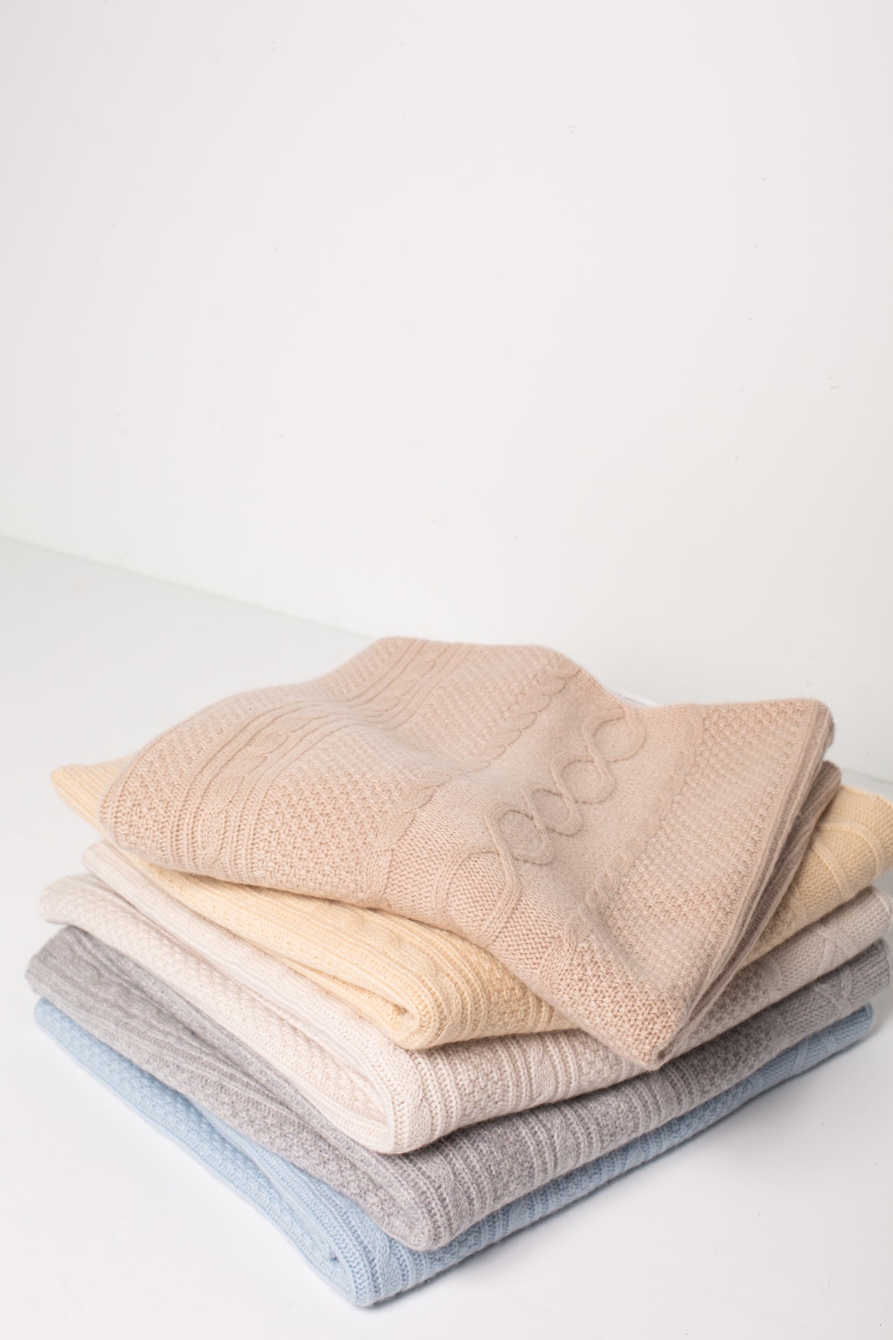 Exquisitely soft and cozy cable knit mini blanket made from the finest cashmere. This truly versatile blanket is ideal for a baby gift, your furry friend and great for travel.