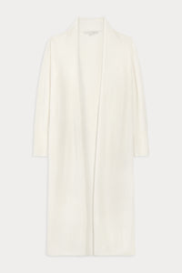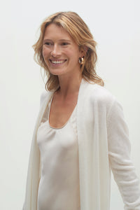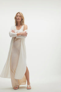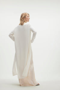 Soft and lightweight cardi in a long silhouette featuring dramatic side vents. Complemented with extra long sleeves and ribbed cuffs.