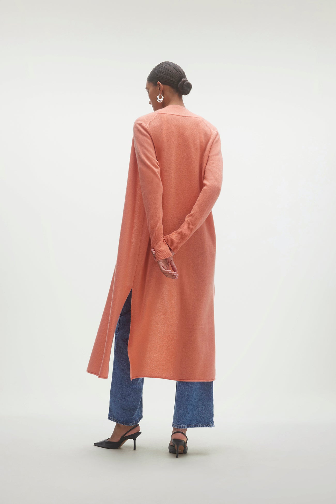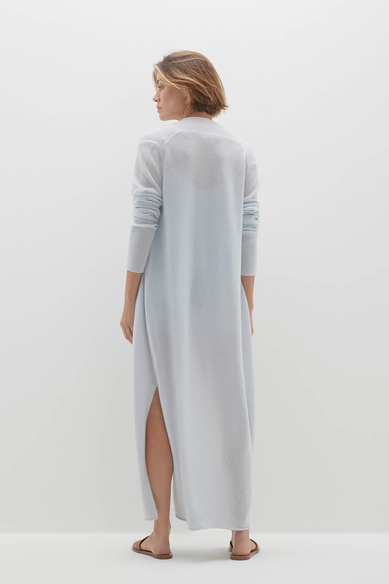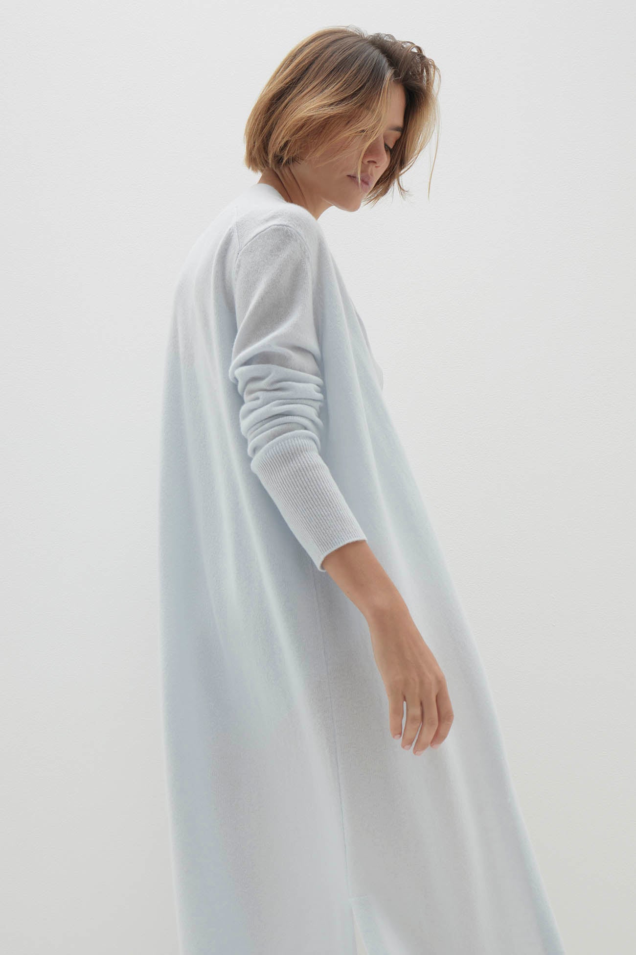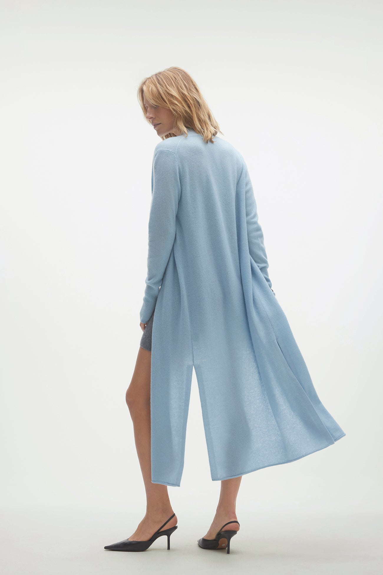 Soft and lightweight cardi in a long silhouette featuring dramatic side vents. Complemented with extra long sleeves and ribbed cuffs.