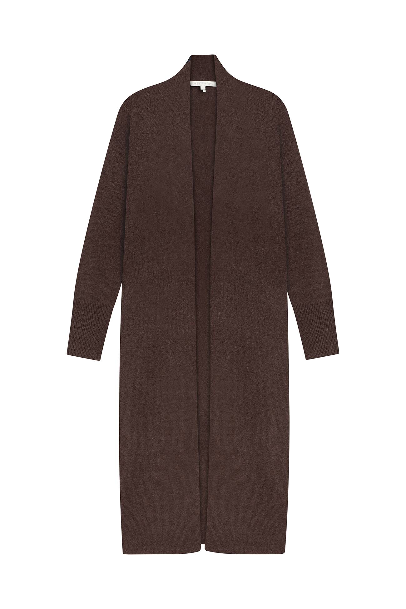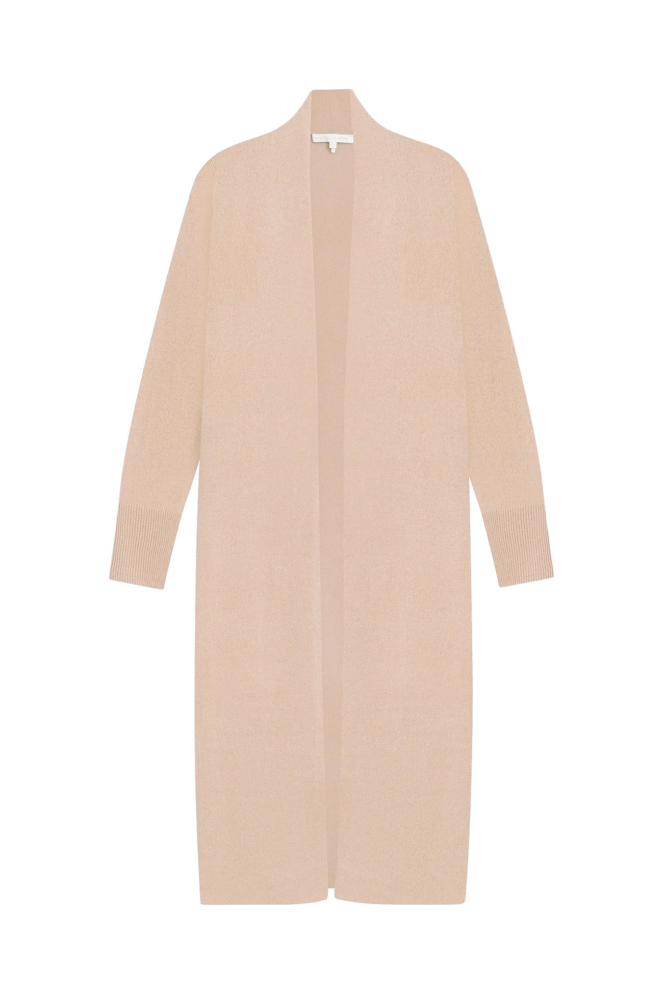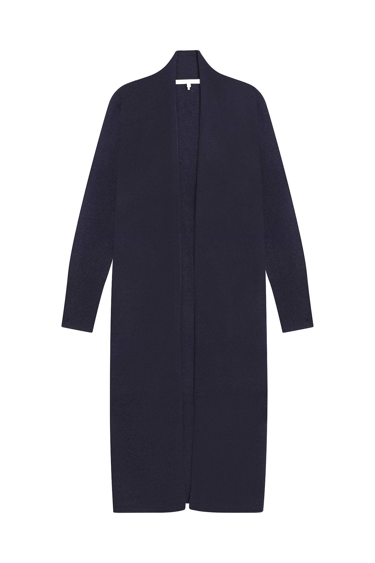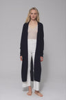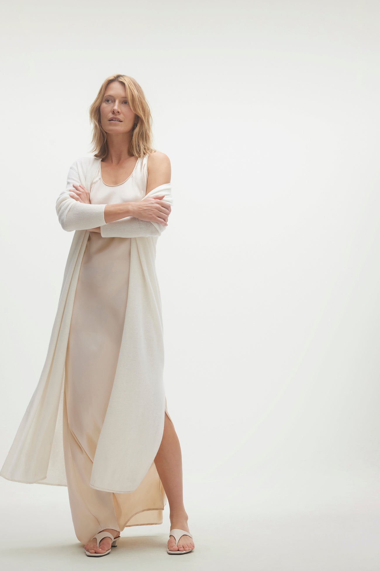 Soft and lightweight cardi in a long silhouette featuring dramatic side vents. Complemented with extra long sleeves and ribbed cuffs.