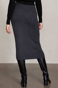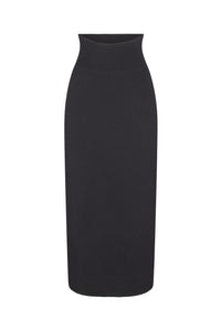 Chic knit pencil skirt that will take you from day to night. Sleek long-line silhouette and thick ribbed waist band for the perfect fit.