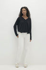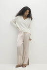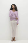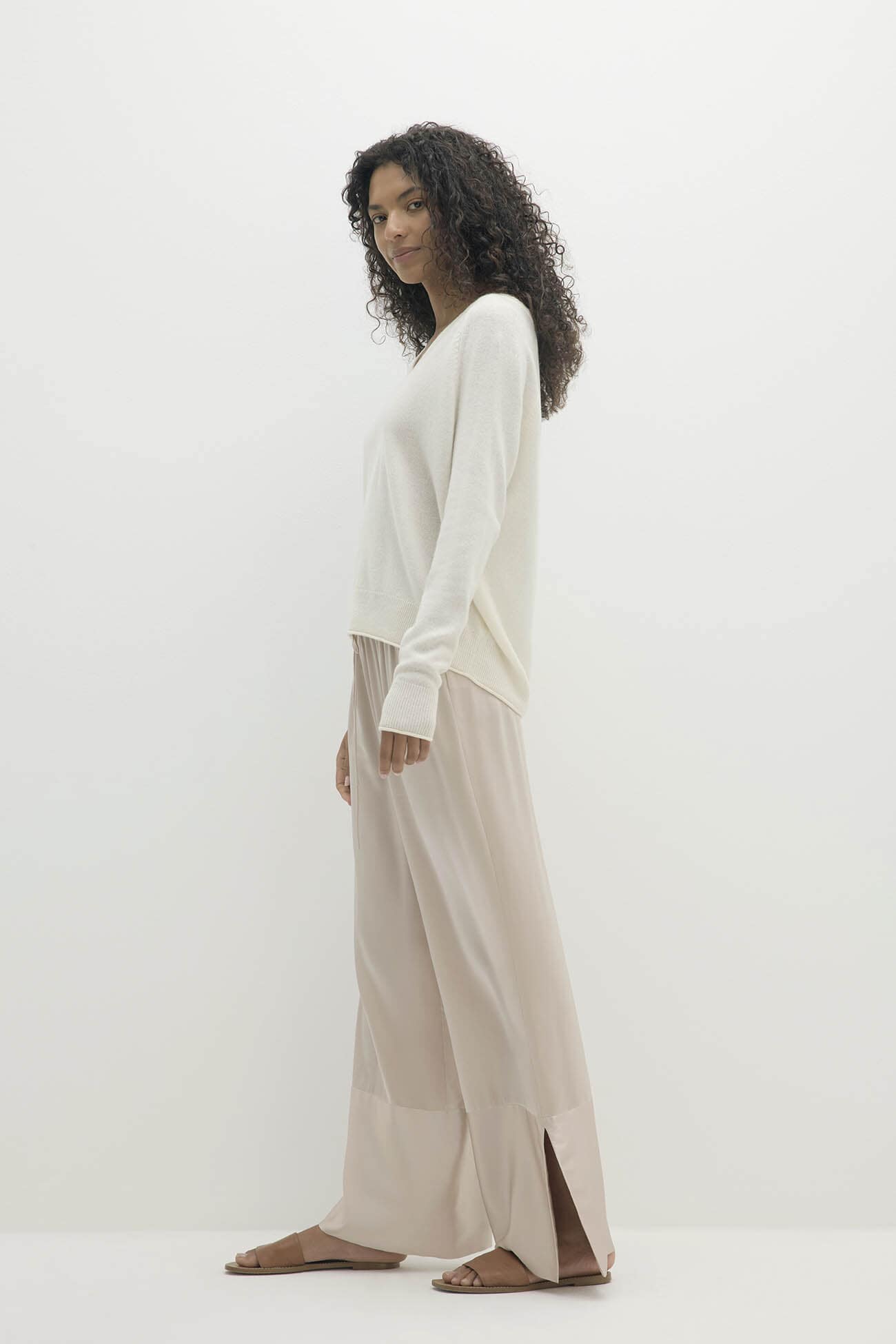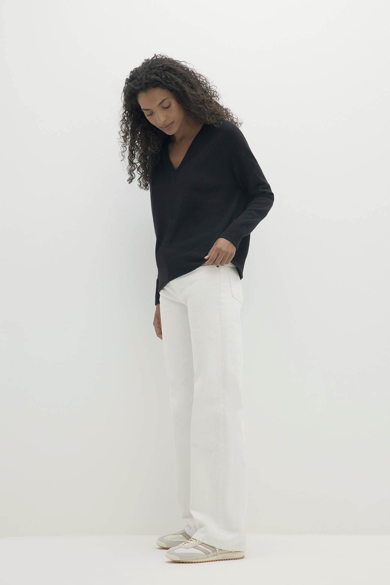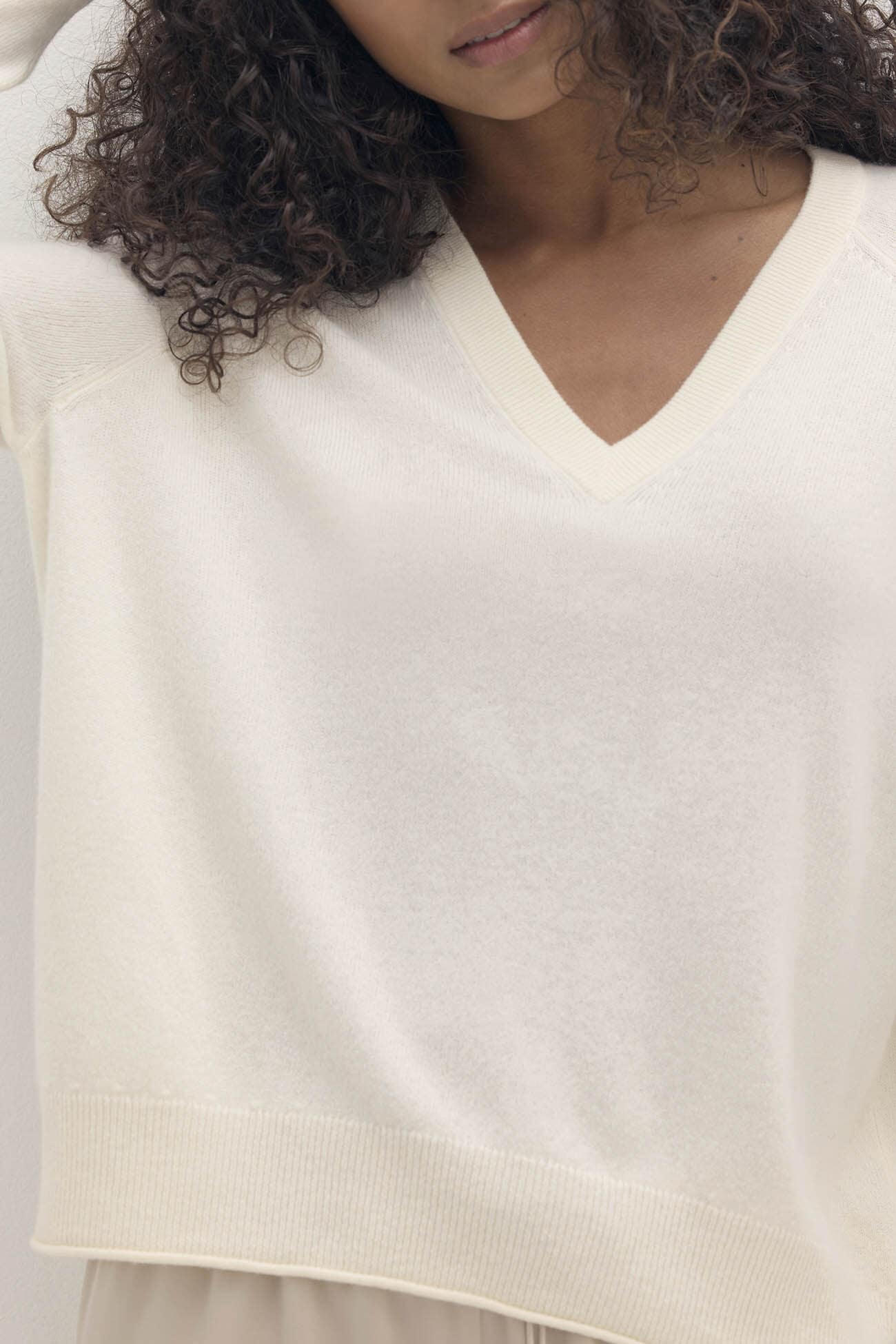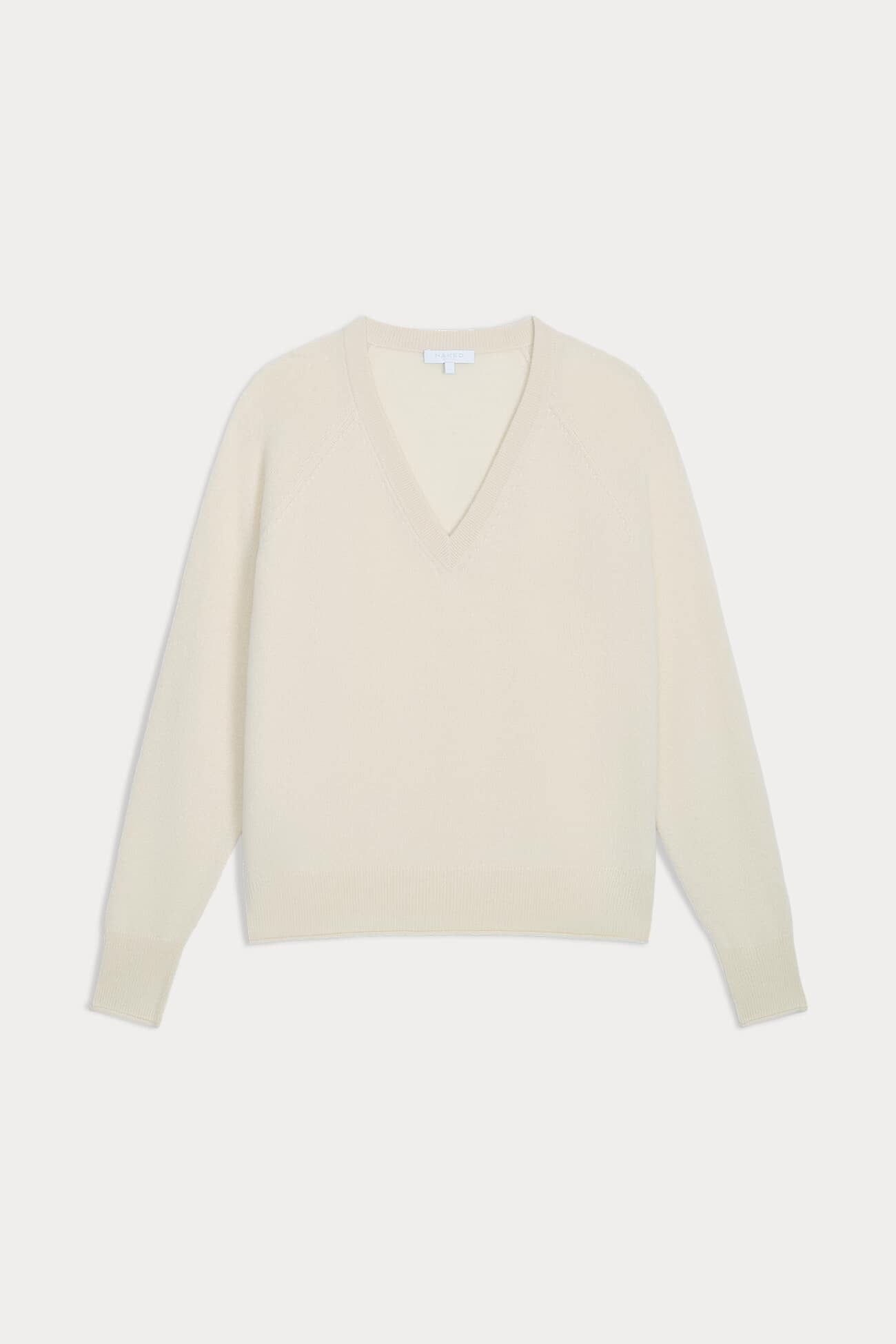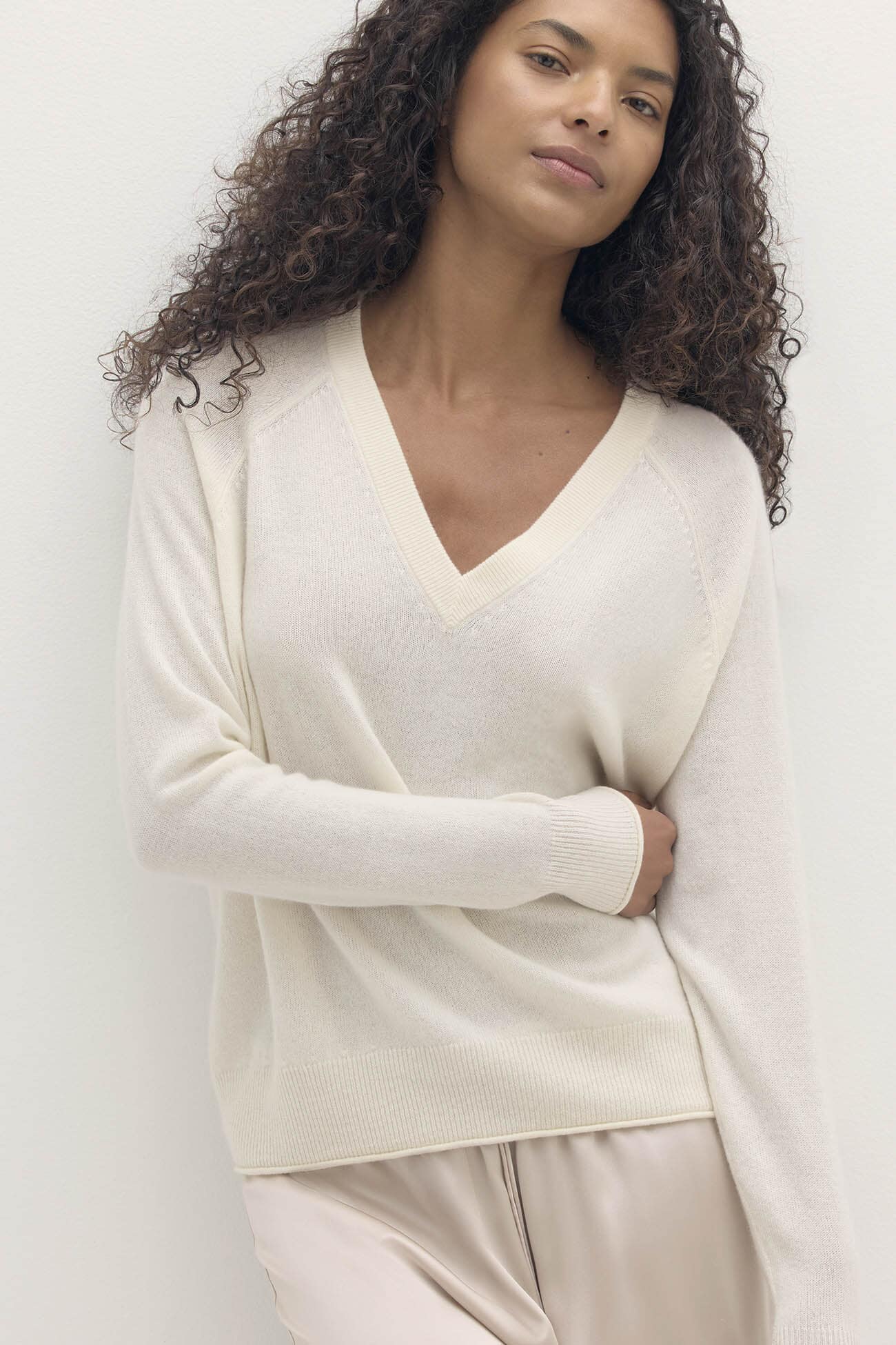 Easy, featherweight V-neck pullover with raglan armholes and ribbed trim for a sleek yet cozy look.