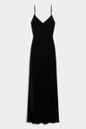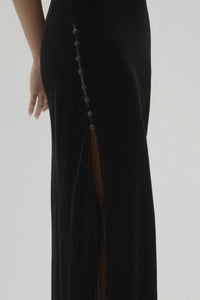 The Jade velvet maxi dress exudes evening glamour with its rich velvet fabric, deep V-neck, and satin button details at the slit. This sleeveless design is perfect for special occasions, offering a bold yet elegant look.