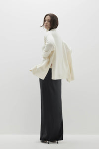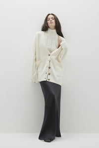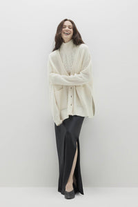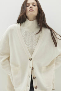 The Lauren Cardigan offers a relaxed boyfriend fit with a classic button-front design. It features practical pockets and stylish side slits. The ribbed trim details enhance its sophisticated look, making it a versatile and cozy addition to any wardrobe.