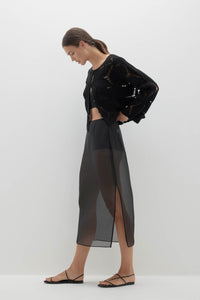 A breathtaking must-have for the season. This silk organza midi skirt skims the body while offering a flirty sheer look. Layer with the Clarissa shorts underneath and the Tulah blouse on top for an elevated ensemble.