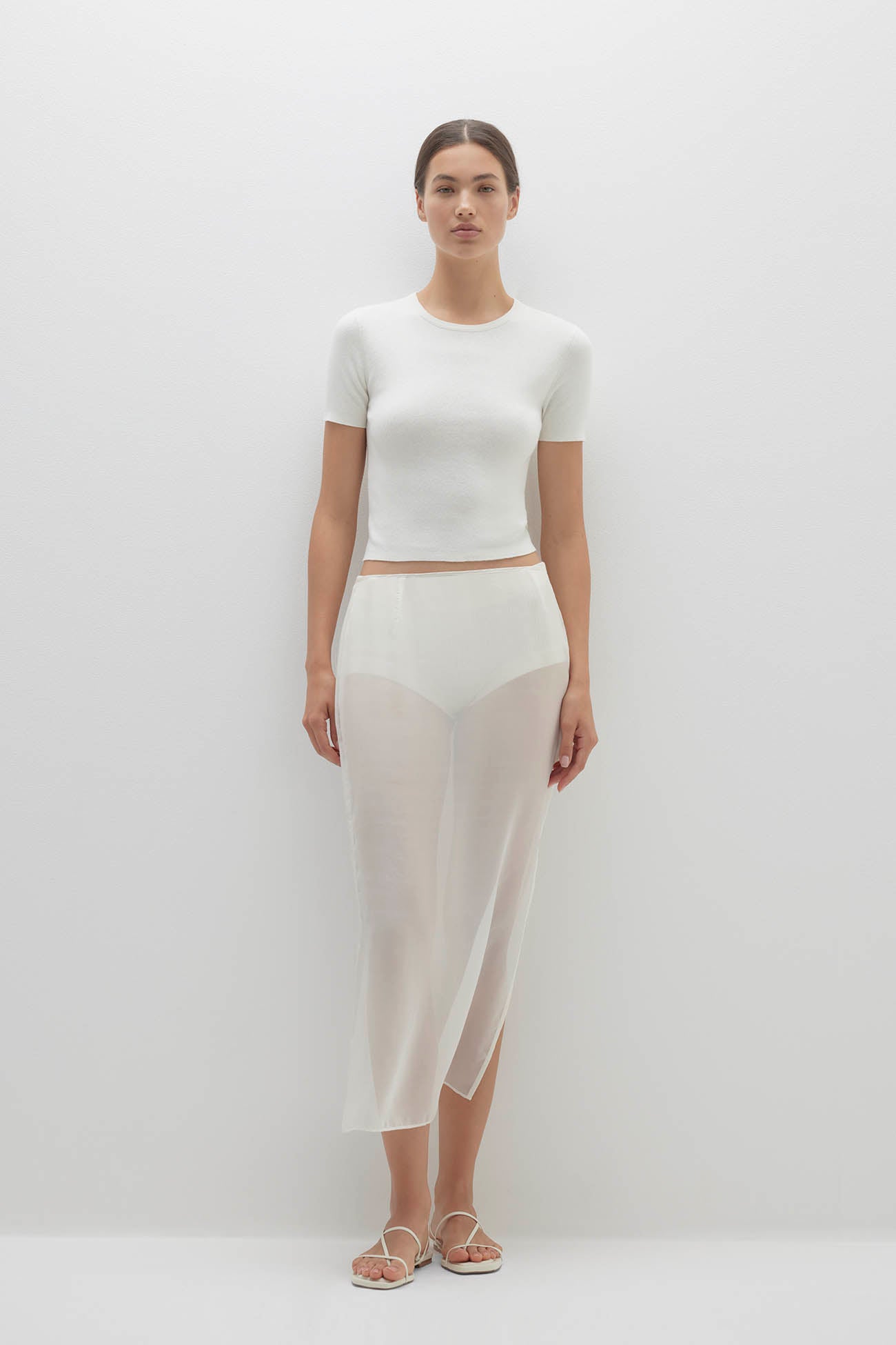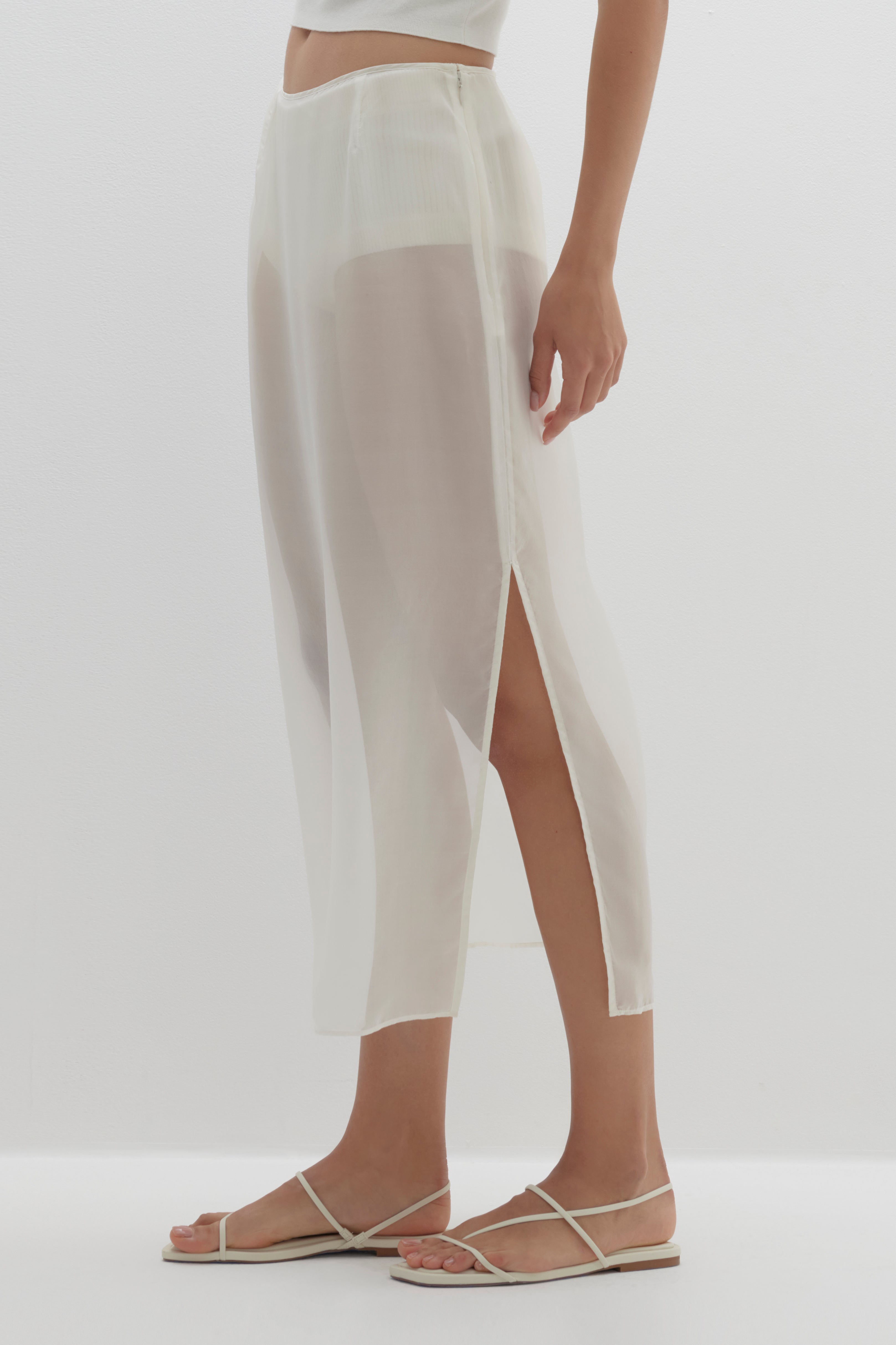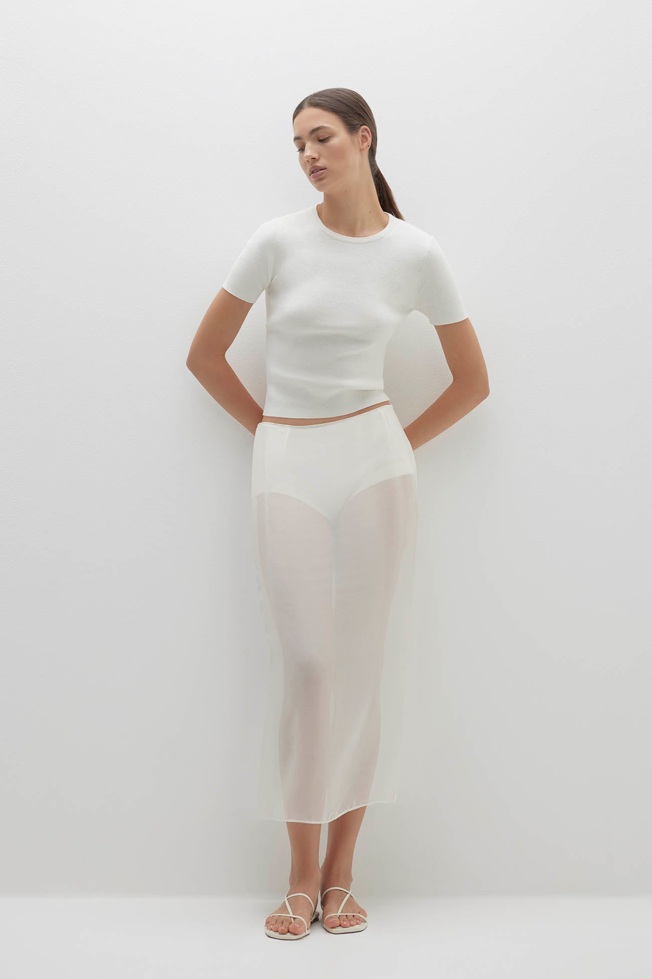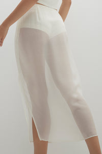 A breathtaking must-have for the season. This silk organza midi skirt skims the body while offering a flirty sheer look. Layer with the Clarissa shorts underneath and the Tulah blouse on top for an elevated ensemble.