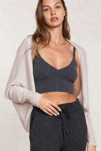 The ideal centerpiece or finishing touch to any look, the Meli is a cropped shrug with open-front design.