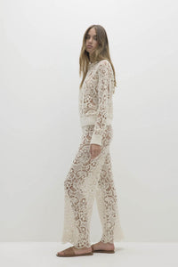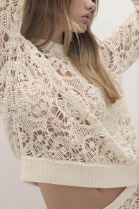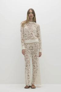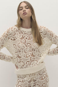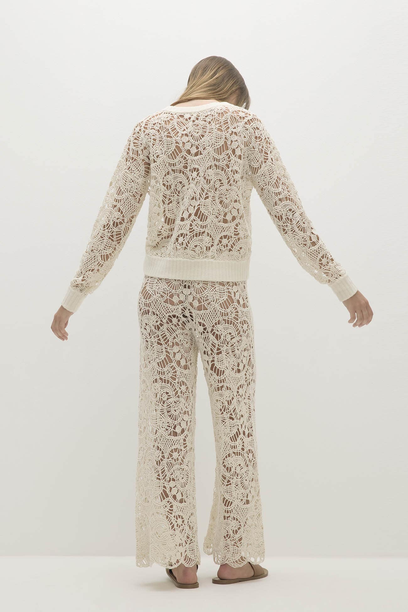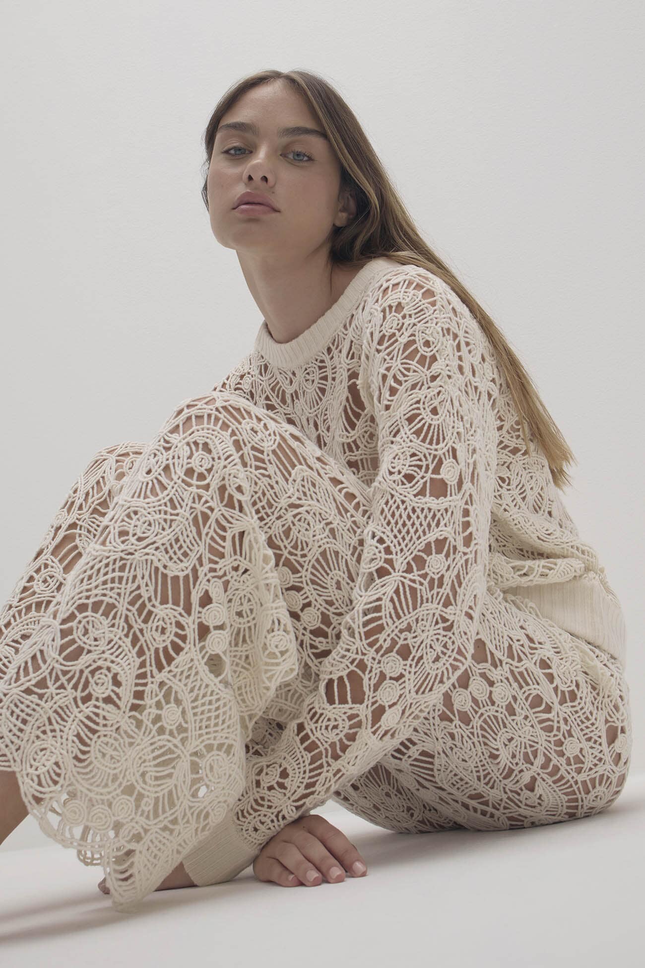 A nature-inspired crochet lace knit crewneck with intricate detailing. Features double rib trims for a polished finish. Pair with the Lorraine Pant to complete the set.