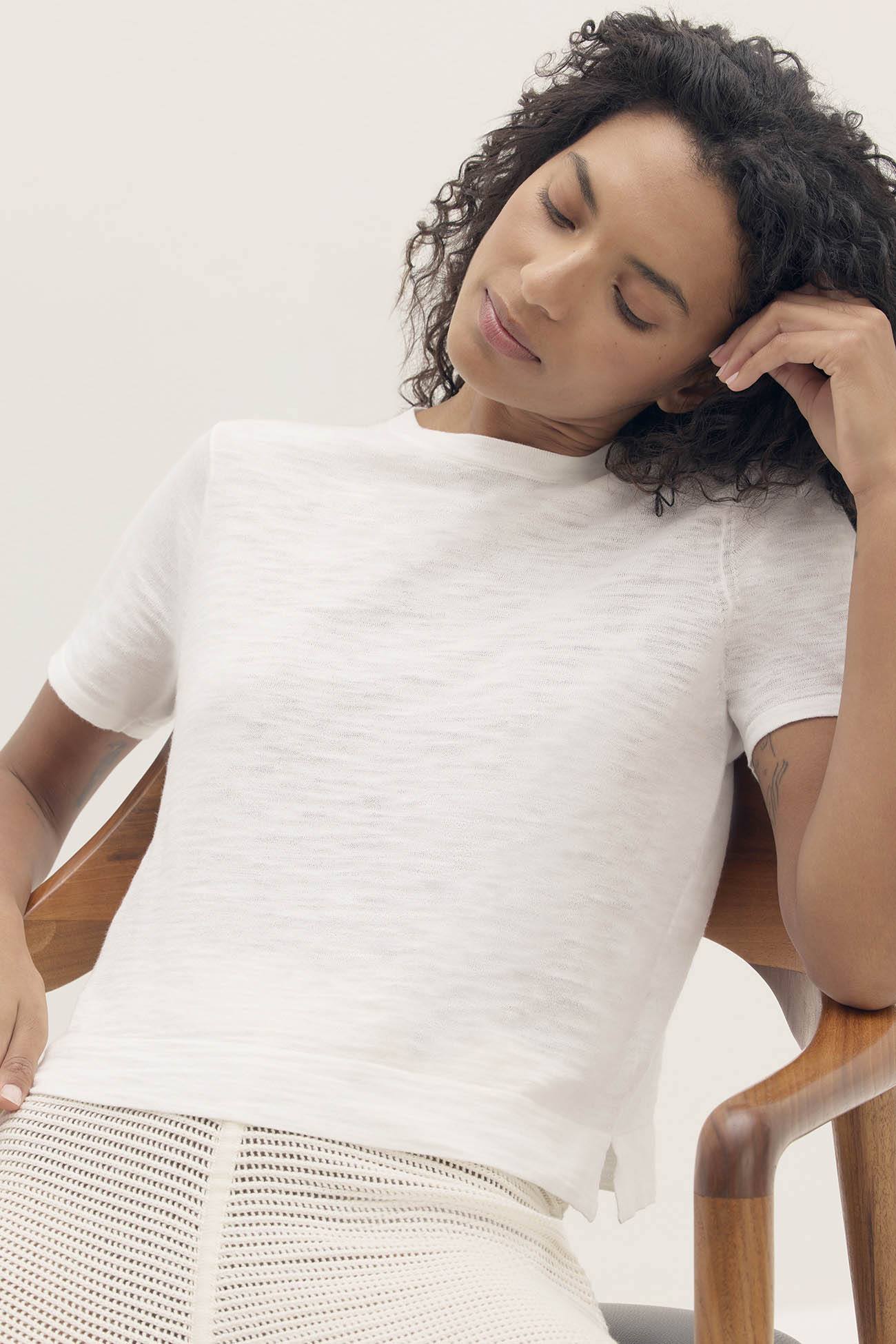 A refined crewneck tee with a slit hem detail, made from organic cotton slub yarn. The Nella is fully fashioned and hand-finished for superior quality.