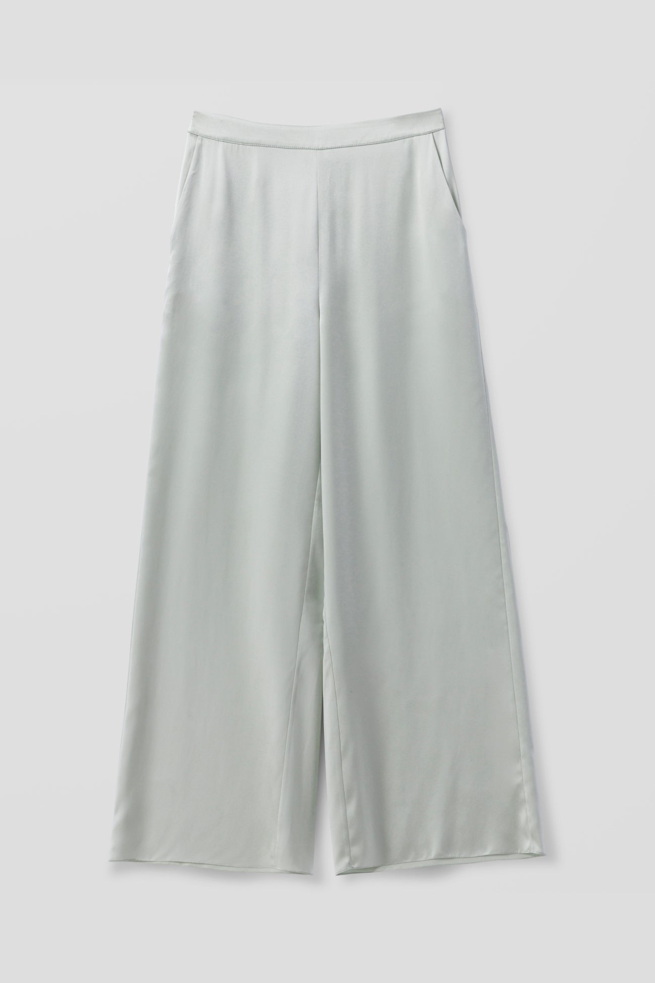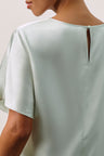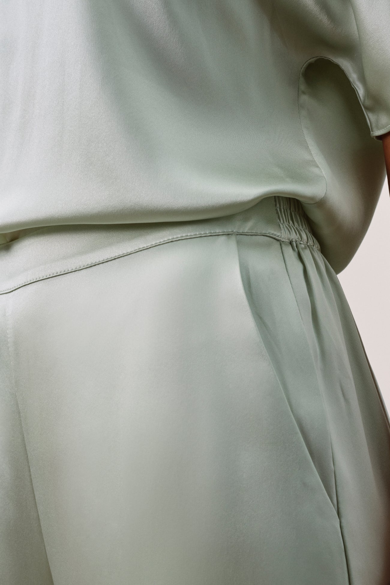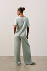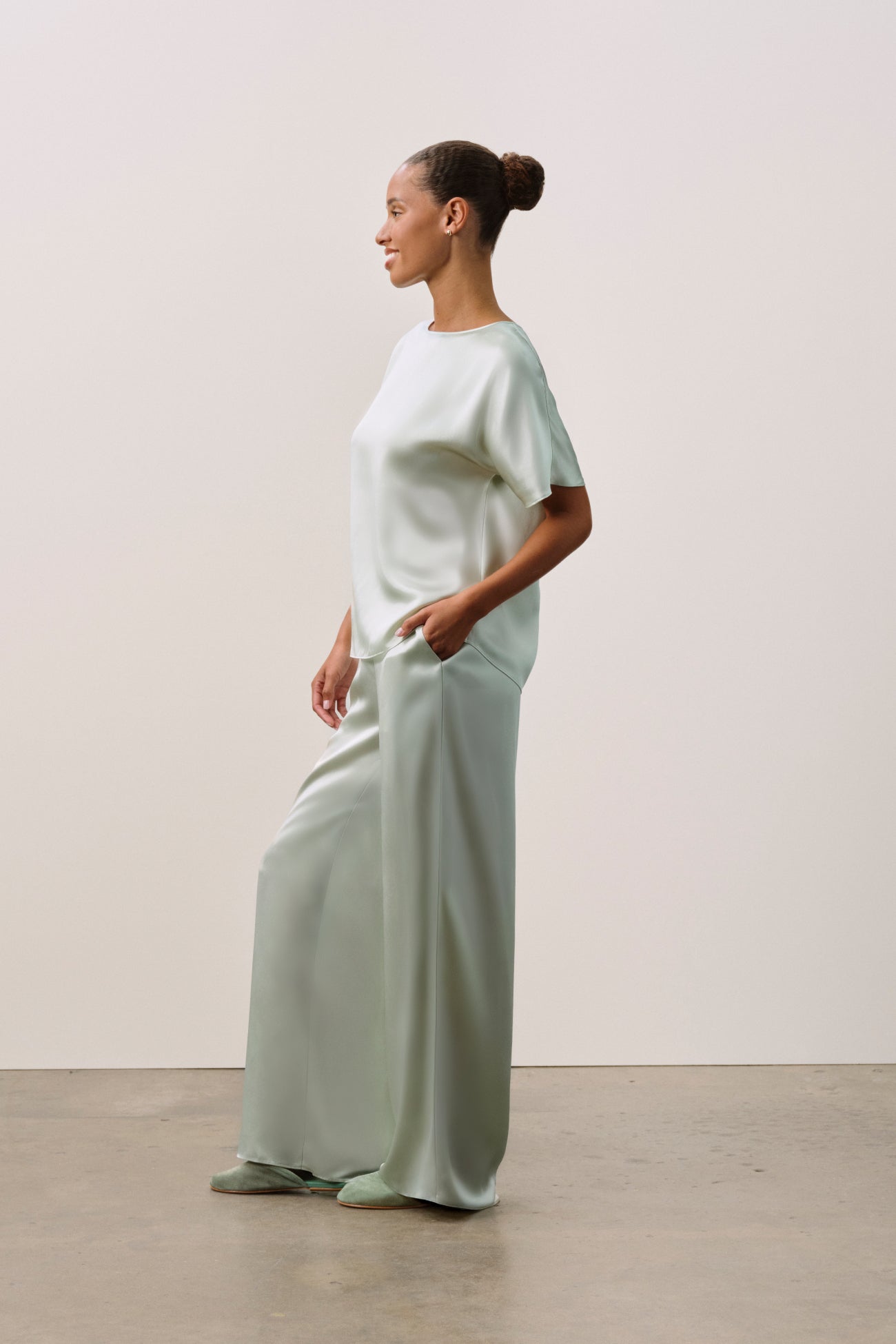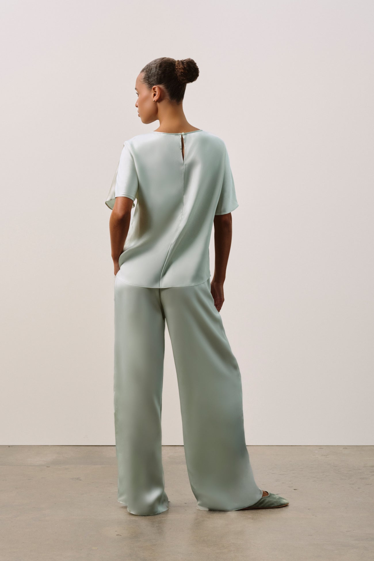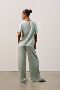 A modern, fluid set in pure silk charmeuse. The longline pull-on pant is designed with a clean flat front, elasticated back, and discreet on-seam pockets, paired with a boat-neck tee featuring a seamless silhouette, genuine shell buttons, and an elegant keyhole detail at the back neckline.