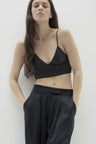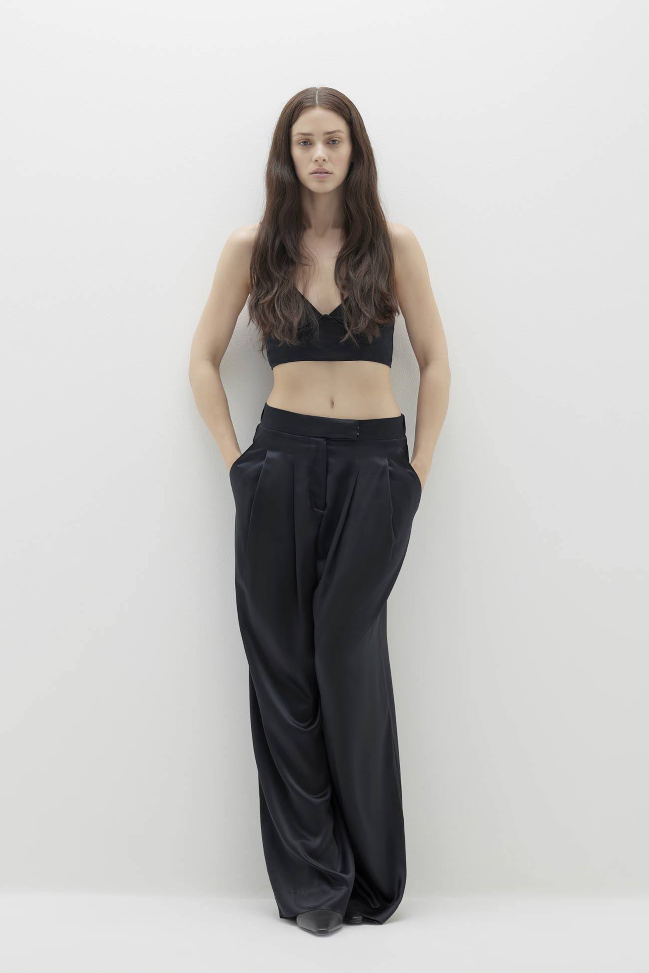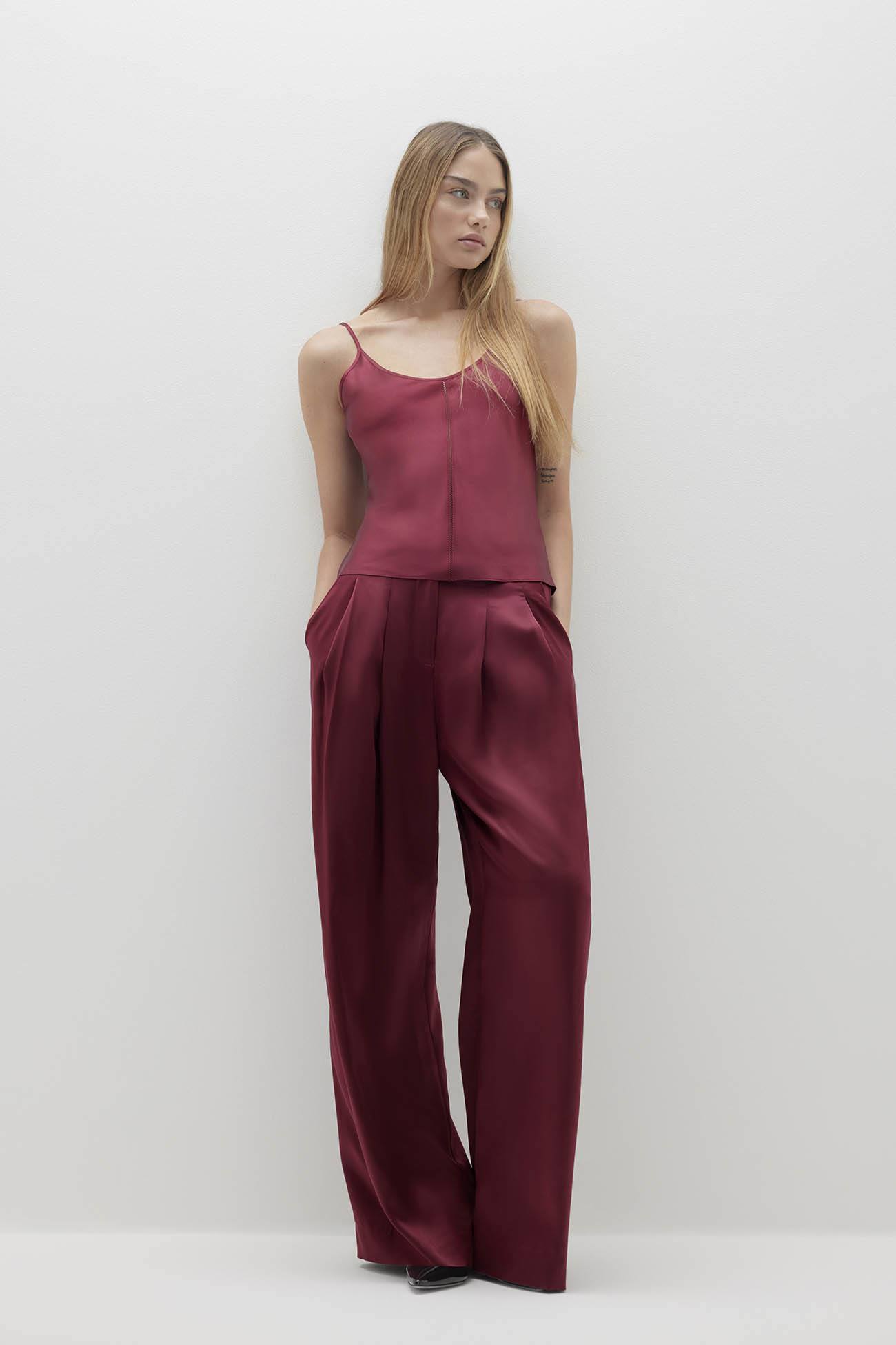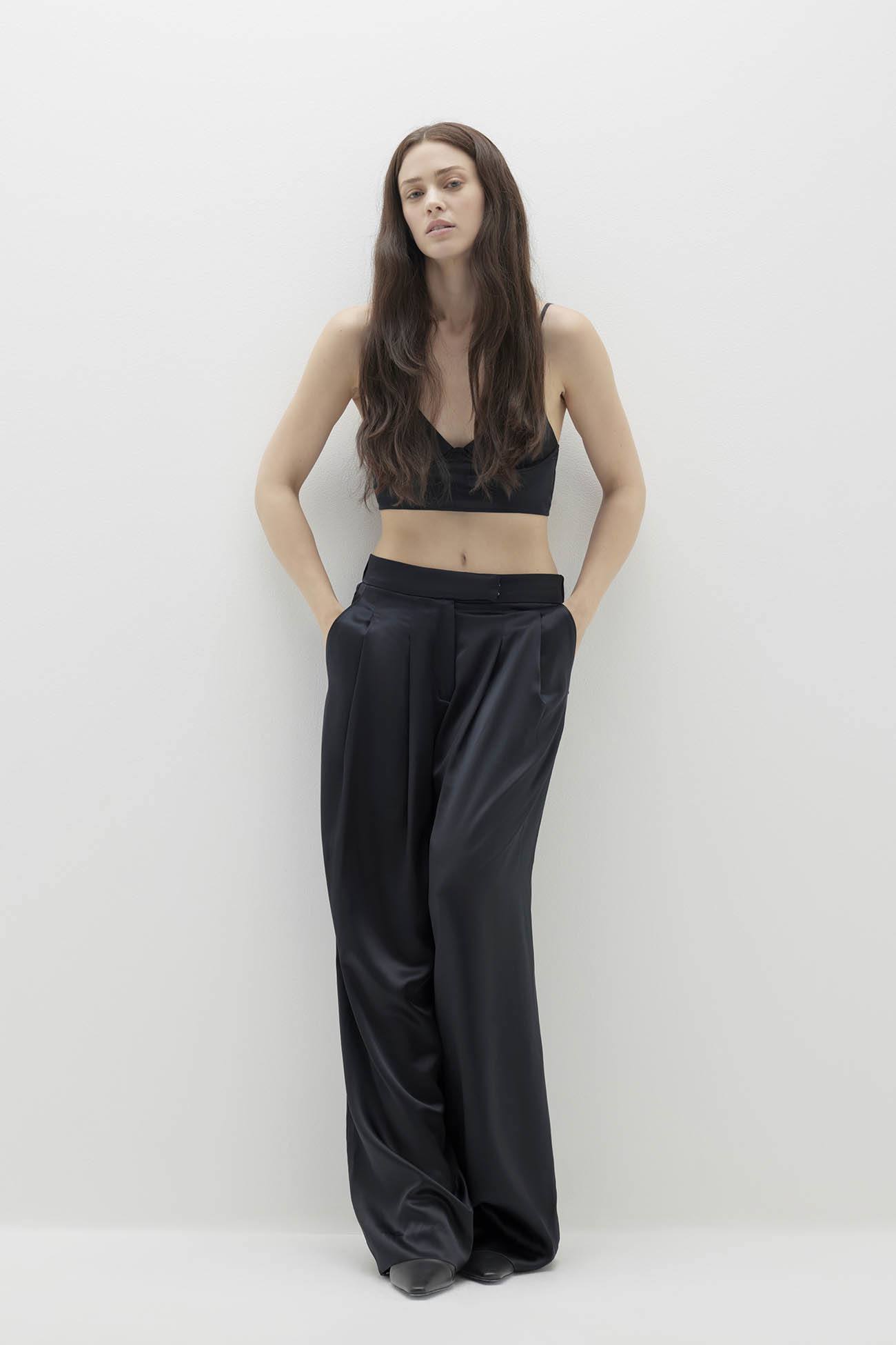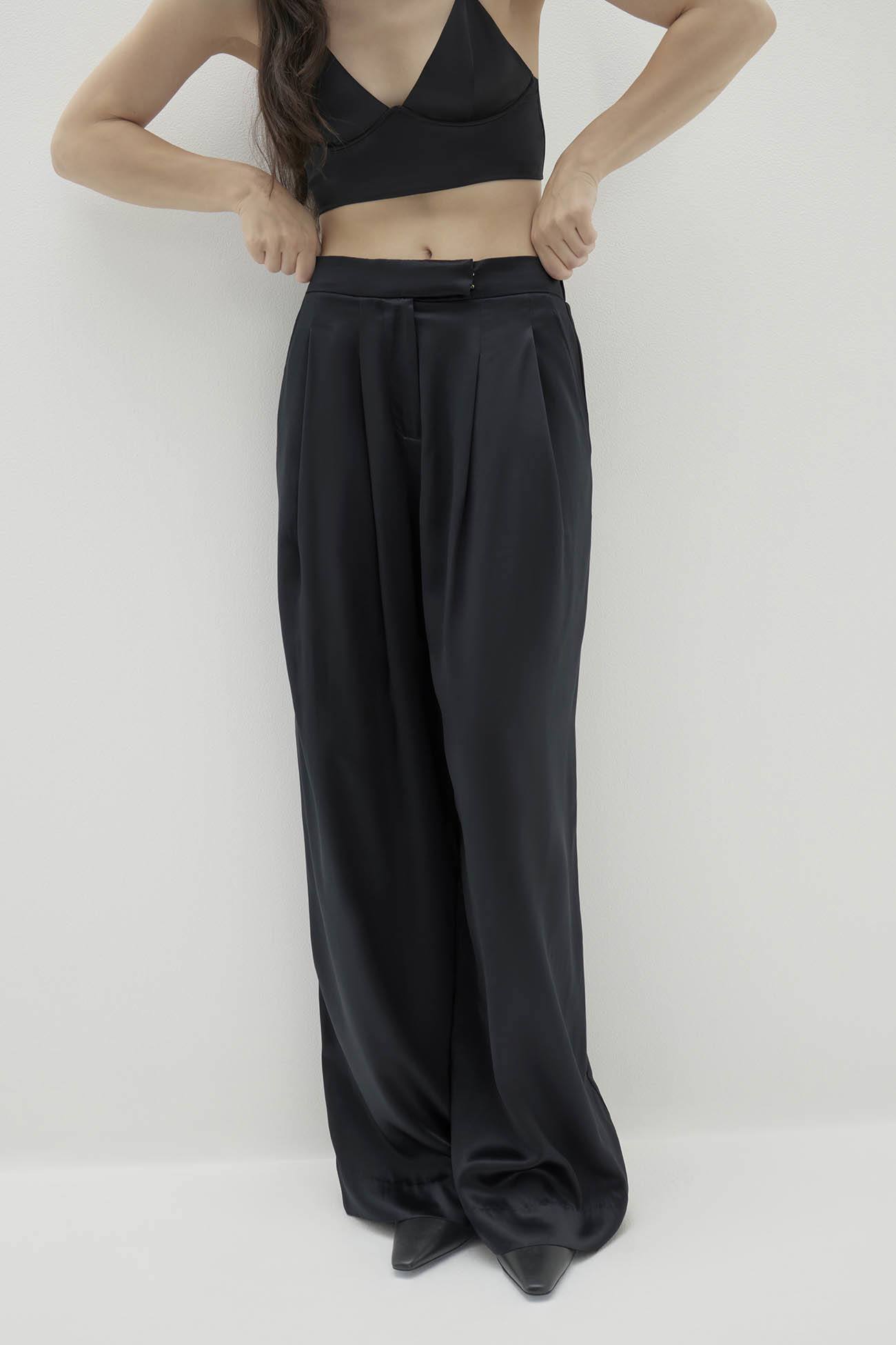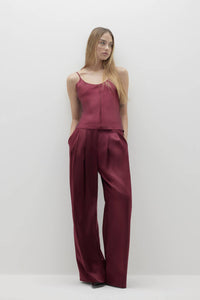 The Rosalie silk trouser is a luxurious wardrobe staple, featuring a wide leg and elegant pleat details. A zip-and-button closure with an elastic back waist offers both comfort and style, perfect for elevating any outfit.