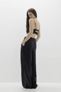 The Rosalie silk trouser is a luxurious wardrobe staple, featuring a wide leg and elegant pleat details. A zip-and-button closure with an elastic back waist offers both comfort and style, perfect for elevating any outfit.