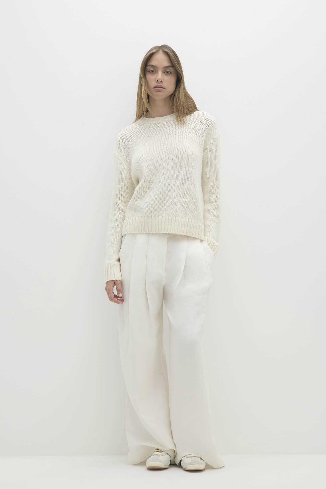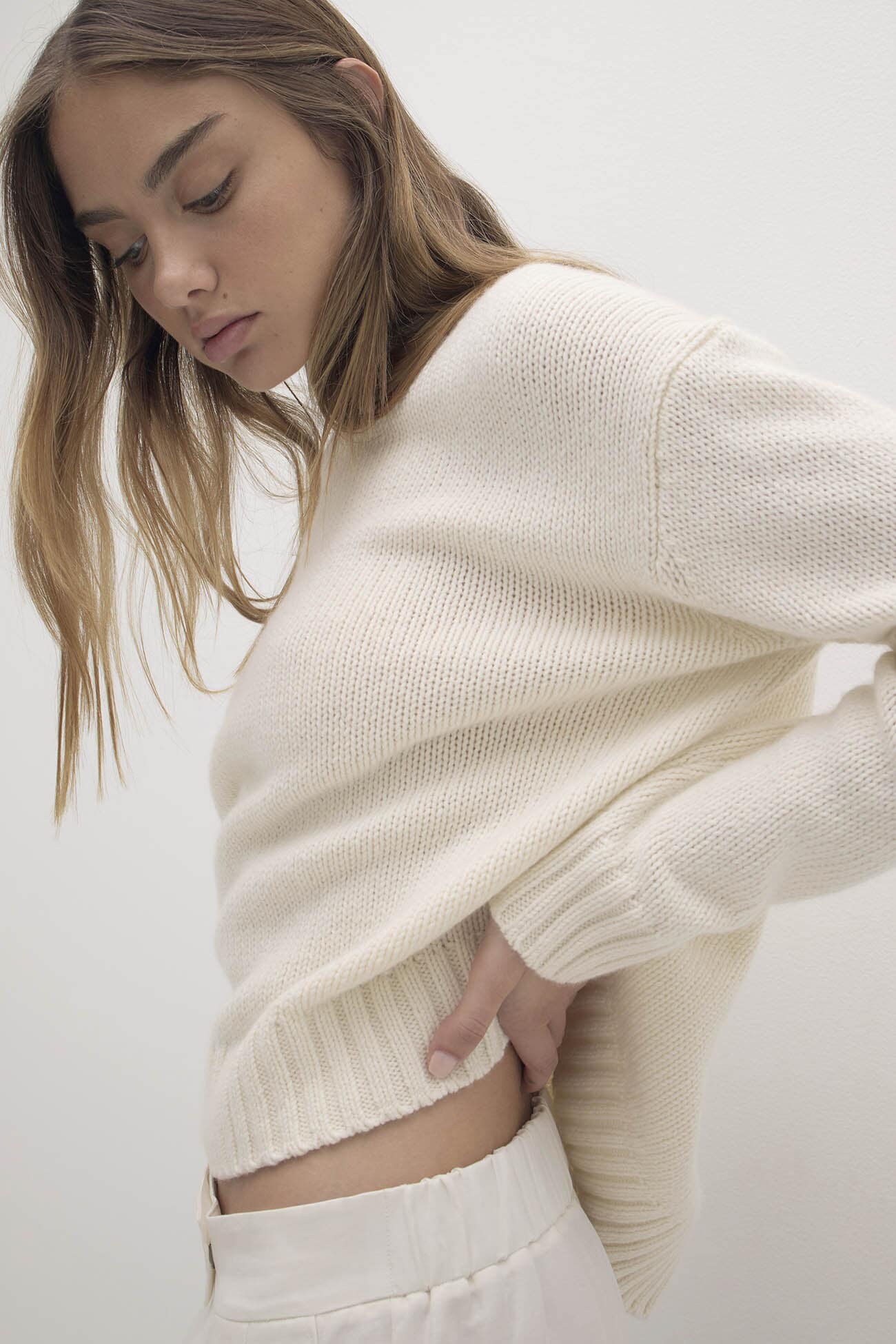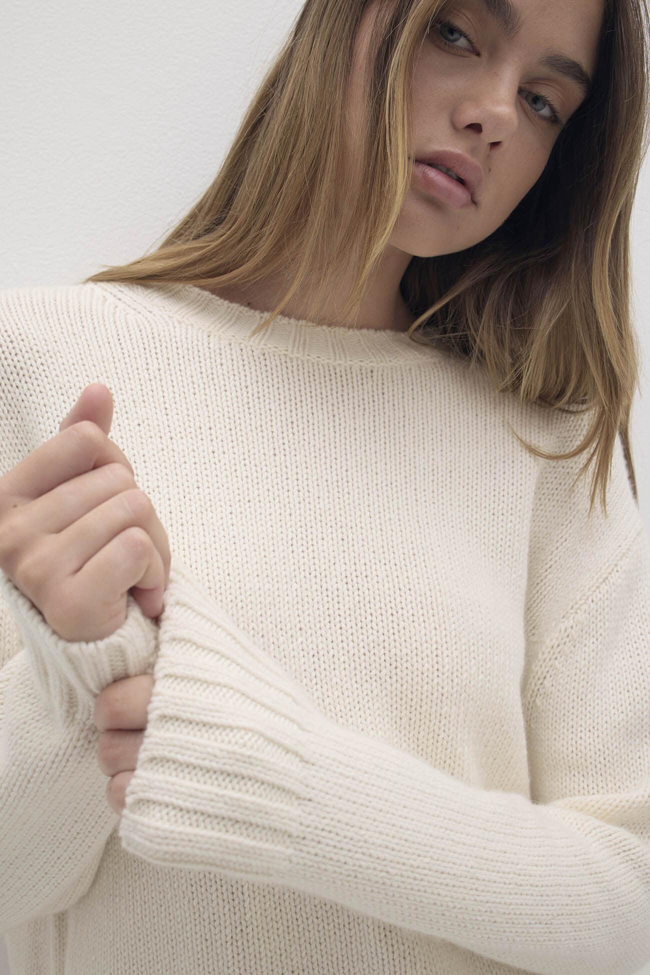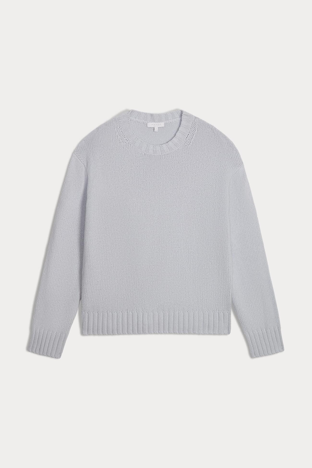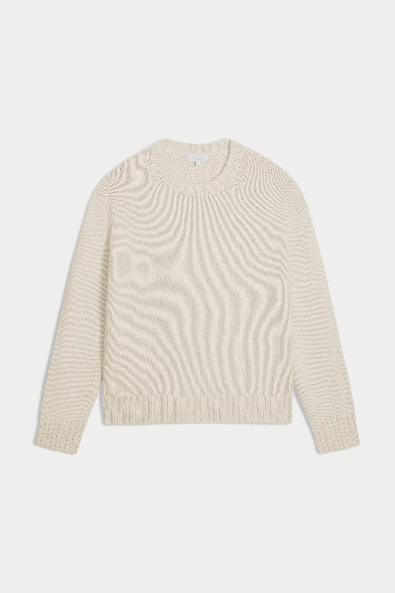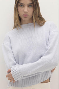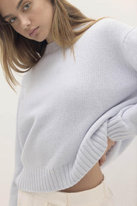The Shelley is a chunky yet lightweight organic cotton-cashmere blend crewneck. Features ribbed trims and a relaxed fit for effortless layering.