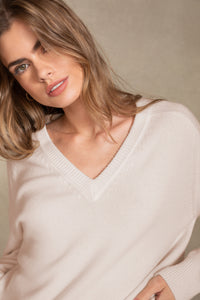 Throw on the Sydney v-neck sweater with ribbed trim details that pair perfectly with any outfit for an effortlessly chic look.